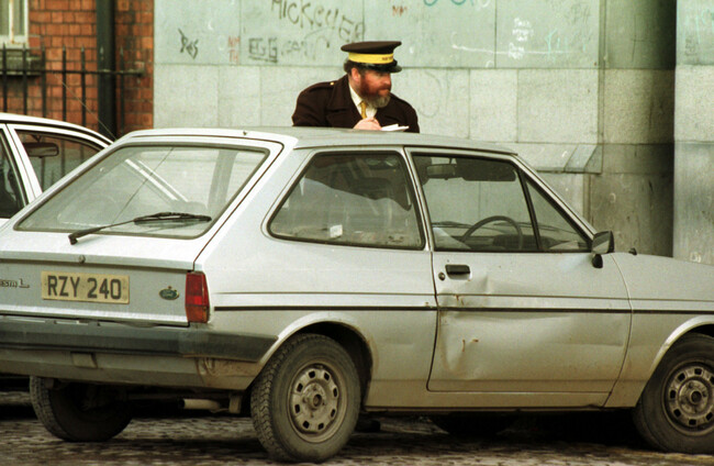 A traffic warden hands out a parking ticket to a Ford Fiesta in 1997. RollingNews.ie