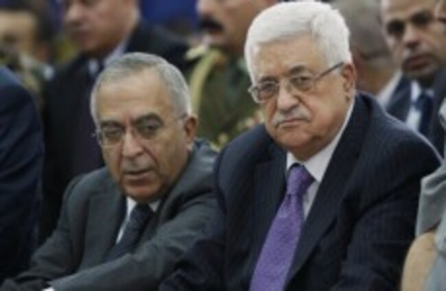 Palestinian Prime Minister Salam Fayyad, left, and President Mahmoud Abbas, right, in Ramallah yesterday. AP Photo/Majdi Mohammed