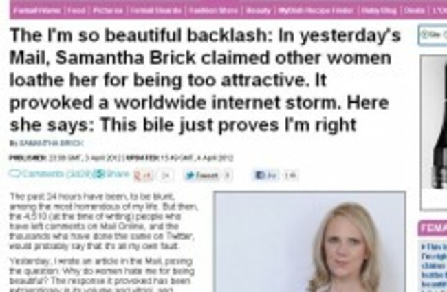 Samantha Brick reacting to the reaction to her story which reacted to women's, er, reactions to her 'beauty'. You following? DailyMail.co.uk