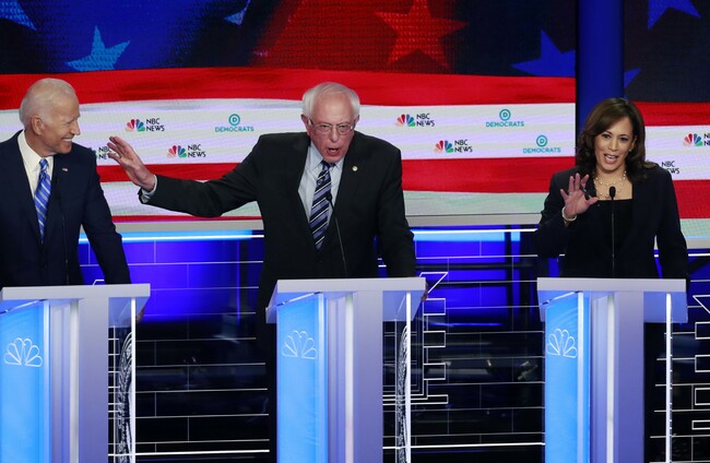 Scenes from Thursday night's debate with (from L to R) Joe Biden, Bernie Sanders and Kamala Harris. Wilfredo Lee/AP/PA Images
