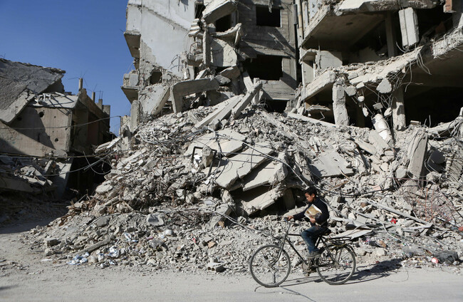 A child rides his bicycle past a destroyed building in the besieged rebel-held city of Douma, Eastern Ghouta province, Syria, March 2018. DPA/PA Images
