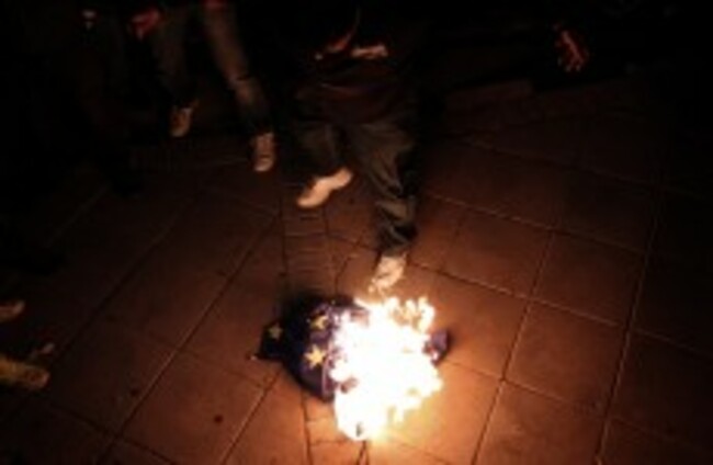 Protesters burn an EU flag outside the Cypriot Presidential palace, during an anti-bailout rally, in Nicosia (AP Photo/Petros Giannakouris)