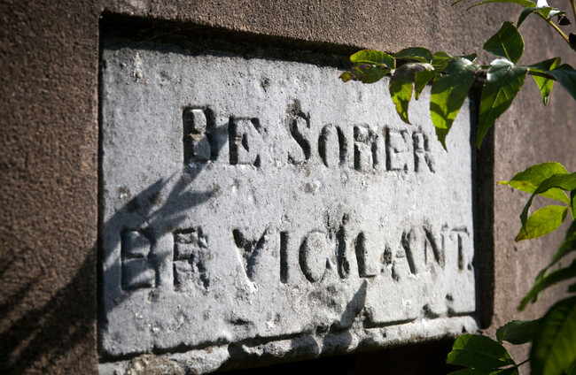 Be Sober Be Vigilant sign on the Old Lock Up or Blind House Gaol Shenley, UK. Alamy Stock Photo