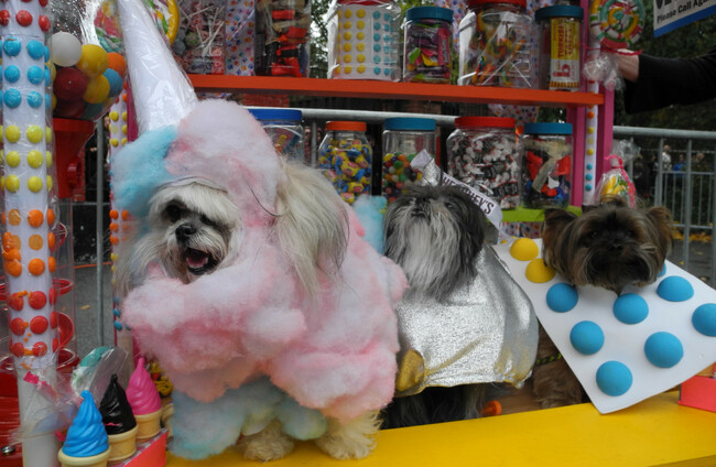 Three costumed dogs stand at the costume parade for the spooky party Halloween in New York, USA, 22 October 2016. Photo: Johannes Schmitt-Tegge/dpa DPA/PA Images