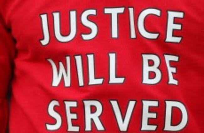 A Liverpool fan wears a message printed on his t-shirt about the Hillsborough justice campaign. SCOTT HEPPELL/AP/Press Association Images