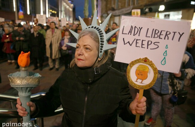 A woman dressed as the Statue of Liberty during a protest against US President Donald Trump's controversial travel ban on refugees and people from seven mainly-Muslim countries. PA Wire/PA Images