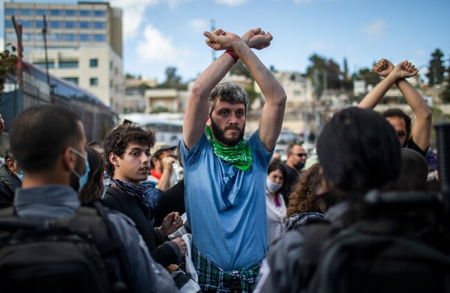 09 April 2021 Jerusalem: Israeli and Palestinian activists during a protest against the eviction of Palestinian families from their homes at the neighbourhood of Sheikh Jarrah. DPA/PA Images