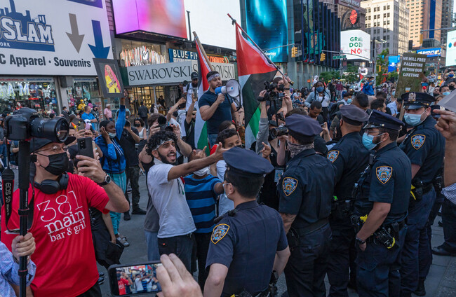 Pro-Palestinian protesters face off with a group of Israel supporters and police in a violent clash in Times Square on 20 May. SIPA USA/PA Images