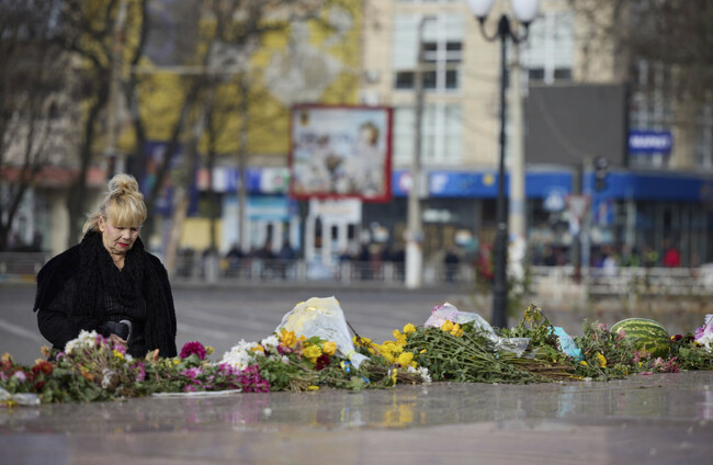 A woman stands in front of bouquets of flowers and commemorates the victims and those killed in Kherson. DPA/PA Images