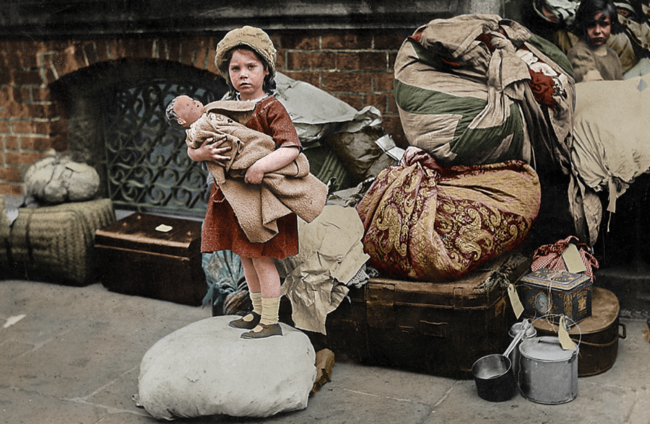 The colourisation brings all this to life in a vivid way. In addition it shows detail that would not previously have been noticed: for example, in the 1922 photo above of the young refugee from pogroms in Belfast, standing outside the Kildare Club (seized by the IRA to house refugees), and one can make out, amongst her pitiful belongings, the elaborate and colourful decorations of a small tea tin.
