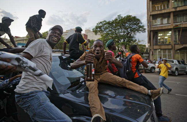 Zimbabweans celebrate outside the parliament building after hearing that President Robert Mugabe had resigned, 21 November 2017. Ben Curtis via PA Images
