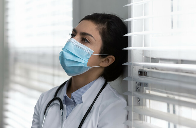 Doctor leaning against a wall with facemask on. fizkes via Shutterstock