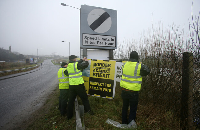 Anti-Brexit campaigners put up signs on the main road between Northern Ireland and the Republic to highlight concerns about the impact on trade. Niall Carson via PA Images