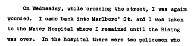 Another wounded man that was brought in on the Wednesday was Patrick McCrea. He was suffering from pellet wounds in the hand, backside and leg which he told me he got in the Post office fighting. His wounds being slight, he was sent out of the GPO with a despatch.