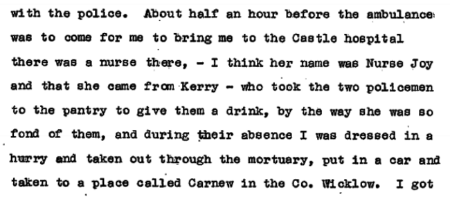 In the next excerpt in the nurse’s testimony, she hints that her and other medics’ sympathies lay with those they saw injured in the conflict, not just civilian casualties but also wounded Volunteers: