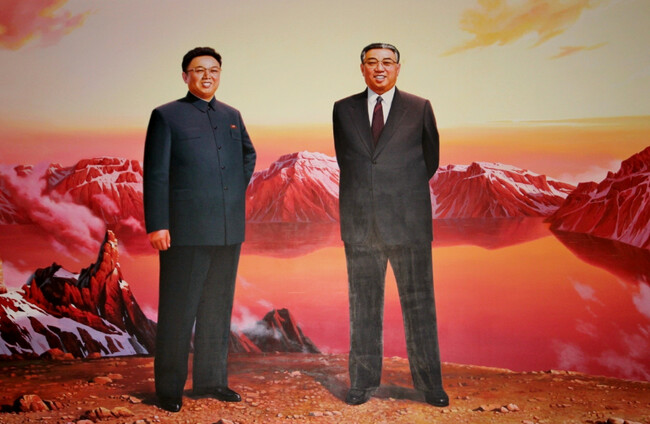 A mural in Sinuiju on the boarder with China. Showing the great and dear leaders standing on the summit of Mount Paekdu. According to North-Korean propaganda, the latter was born here in 1941 Tom Farrell