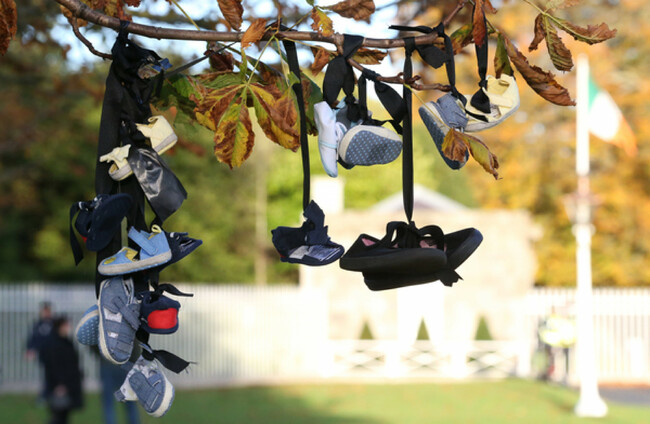 Baby shoes tied to a tree during a Mother and Baby Home protest event at Áras an Uachtaráin Sasko Lazarov/RollingNews.ie