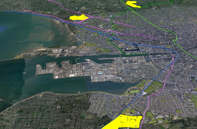 In the map below – the blue line is the Dart, the light green line is the Luas, the dark green line is the Dodder Greenway, which is under development and the pink line donates the BusConnects rapid bus corridors, which are also under development.