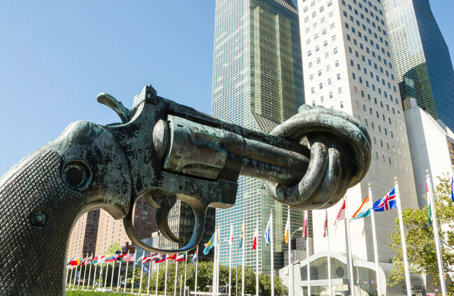 The 'Knotted Gun' sculpture outside the United Nations headquarters in New York. Alamy Stock Photo