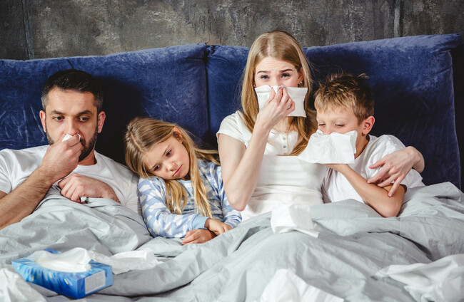 familyoffourhasaflueandlyingonbed Shutterstock / LightField Studios Shutterstock / LightField Studios / LightField Studios