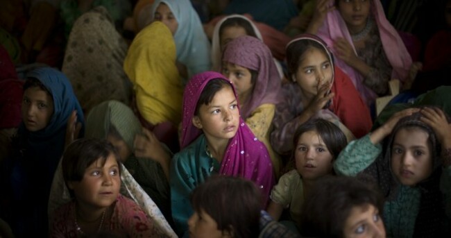 Pakistani girls from the Bajur tribal region are seen in a school supported by UNICEF at the Katcha Garhi camp in Peshawar, Pakistan, 23 Oct, 2008. AP Photo/Emilio Morenatti