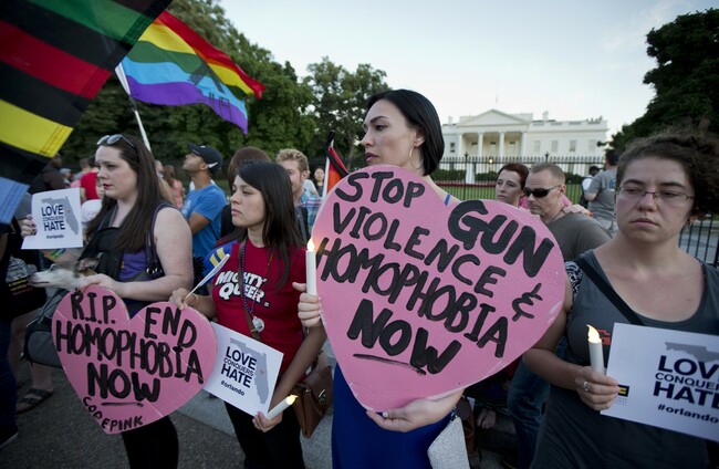 Rachel Henry, from left, Selene Arciga, Nicolette Gullickson, Joanna Lamstein join members and supporters of the LGBT as they gather for a candlelight vigil in front of the White House. Manuel Balce Ceneta