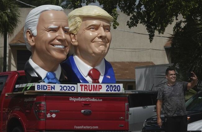 A passerby stops to take a selfie with foam sculpture depictions of President Donald Trump and Democratic presidential candidate former Vice President Joe Biden along Dixie Highway in Fort Lauderdale, Fla., Thursday, Sept. 3, 2020. (Joe Cavaretta/South Florida Sun-Sentinel via AP) Joe Cavaretta