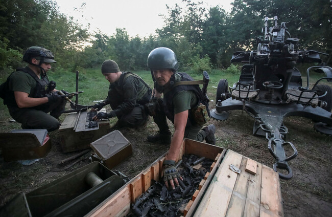 Ukrainian servicemen load projectiles into a weapon belt next to a ZU-23-2 anti-aircraft cannon at a position near a front line in the Kharkiv region, as Russia's attack on Ukraine continues, Ukraine Alamy Stock Photo