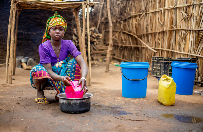 Beti, 15, washes dishes outside the family's shelter in Mozambique. Plan.ie