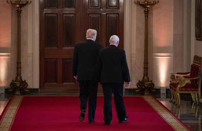 President Donald Trump and Vice President Mike Pence depart after a news conference. Al Drago