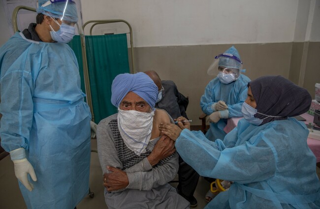 A Kashmiri man receives the COVISHIELD vaccine for COVID-19 at a primary health center in Srinagar, Indian controlled Kashmir, Wednesday, April 28, 2021. Dar Yasin