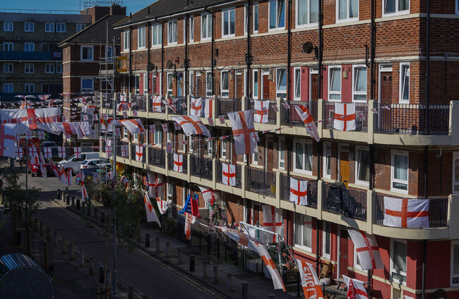 The Kirby Estate in Bermondsey, South east London covered in St George's cross flags and bunting after England qualified for the Euro 2024 final. Alamy Stock Photo