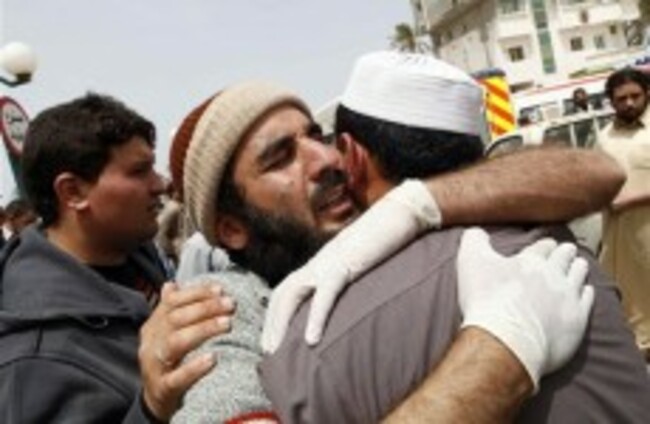 Mourners embrace near the body of a Libyan rebel, whom they say was killed in fighting in Misrata, Libya, Sunday, April 24, 2011. AP Photo