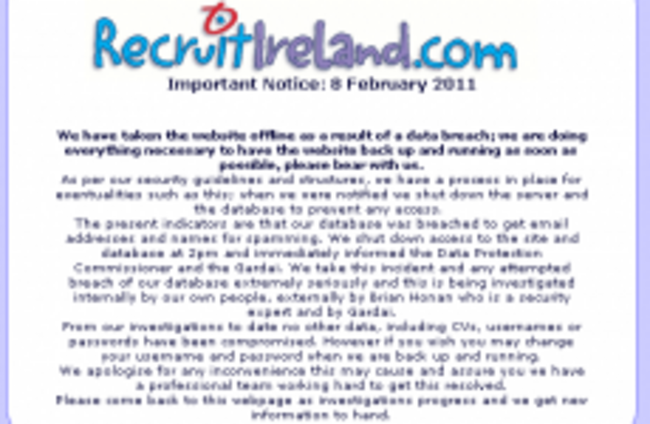A message on the RecruitIreland.com homepage, as the site remains offline following a data protection breach.