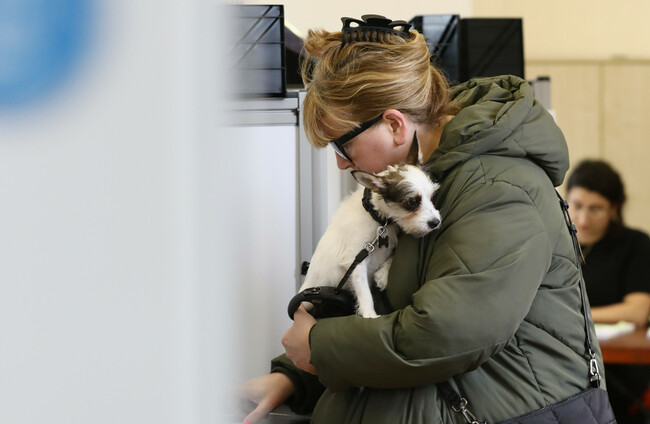 Polling Station-11_90700817 Rolo at Scoil Treasa Naofa on Dunore Avenue in Dublin 8, accompanying their owner Deirdre while she casts her vote. Rolling News Rolling News