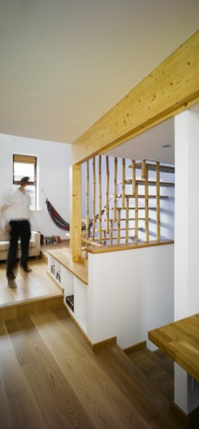Using light-coloured materials throughout such as timber flooring, bamboo stair balustrades and white paint with a pop of colour to decorate the now light-filled living and dining room, a complete transformation has taken place.