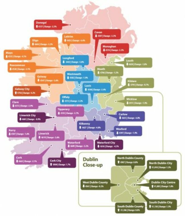 Since Q2 2011, rents are up 2 per cent in Dublin, up 1.7 per cent in Cork and 0.2 per cent higher in Galway. Rents fell by 4.5 per cent in Waterford and 0.9 per cent in Limerick cities.