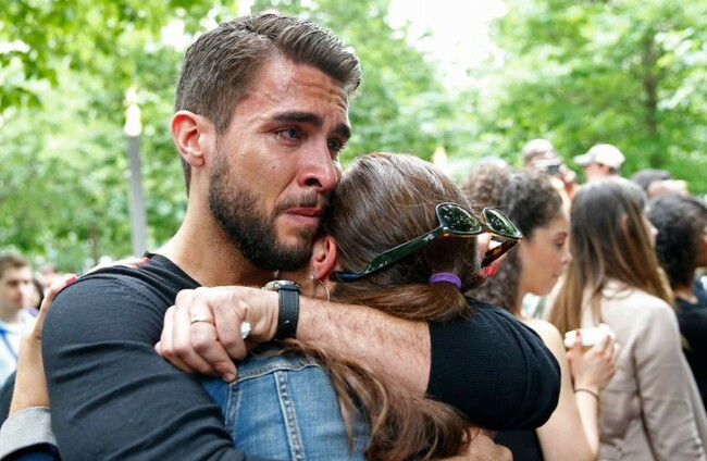 Josh Segarra, who is from Orlando, embraces his wife Brace following a tribute a tribute to the Orlando nightclub shooting victims at the Survivor Tree of the 9/11 Memorial and Museum last Thursday. Kathy Willens/AP/Press Association Images