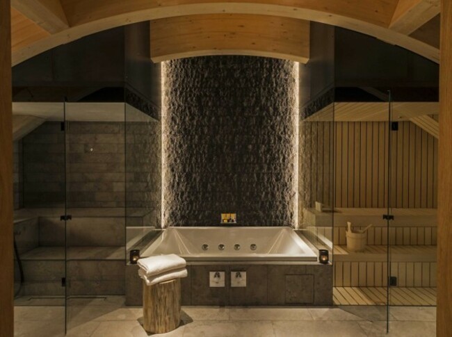 The 105-room luxury hotel has a ski-in living room, an après-ski outdoor hydrothermal bath, a 115-foot-long indoor heated pool, an extensive wine and cigar library, and a walk-in cheese cellar.