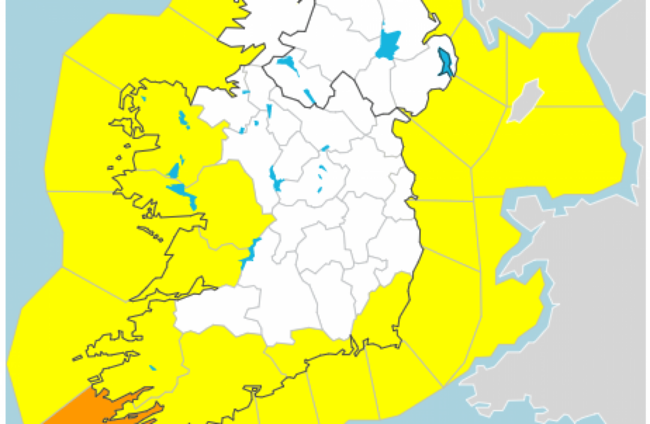 A Status Orange wind warning has also been issued for Cork, effective until midnight; and a Status Yellow wind warning has been issued for Waterford and Wexford, effective until 4pm today.
