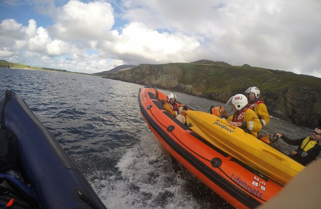 When they arrived at the scene, the fishermen pointed out to the volunteer lifeboat crew where the distressed sheep was located. A kayaker arrived, and paddled in close to the cliff in an attempt to encourage the animal back up the hill.
