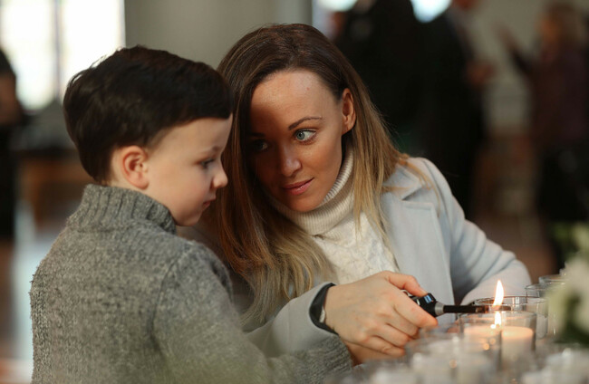 Lisa Marie Maher and her son Harry Foy (5) light a candle in remembrance of Harry's grandfather Eugene Maher. Robbie Reynolds