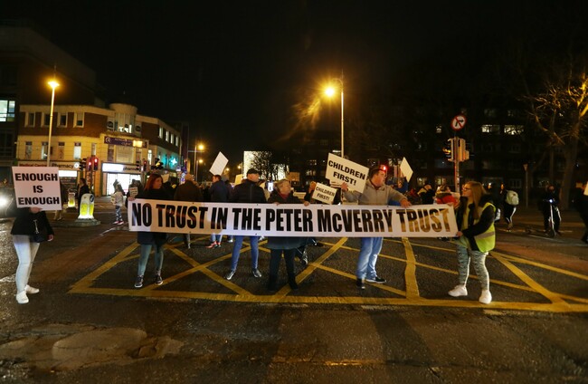 Demonstrators held signs bearing slogans like “Homes not hostels”, “Children first”, and chanted “no more hostels, build more homes” outside Avalon House, which had been earmarked for Ireland’s largest hostel for rough sleepers.