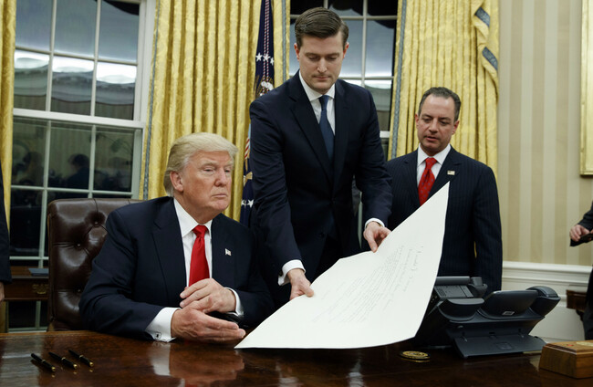 White House staff secretary Rob Porter hands President Donald Trump a confirmation order Evan Vucci
