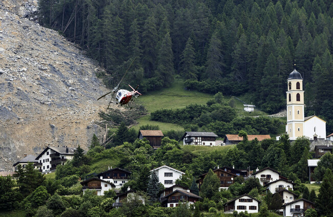 A helicopter flies over the rockfall above the village of Brienz in Switzerland