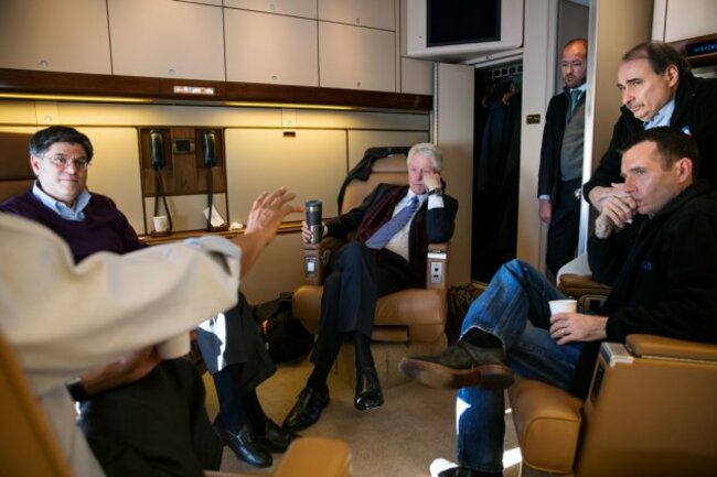 This one of the President in conversation with (from left to right) Chief of Staff Jack Lew, former President Bill Clinton, Justin Cooper, David Axelrod, and Senior Advisor David Plouffe aboard Air Force One en route to Manchester, New Hampshire on 4 November: