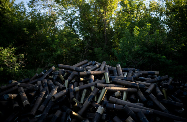 Spent shells lay piled up on the front line in the outskirts of Lyman, Ukraine Bram Janssen/AP