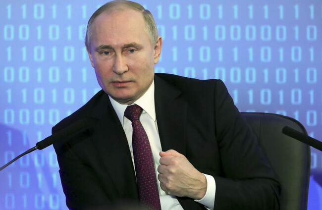 Russian President Vladimir Putin gestures while speaking during a meeting of the Russia's Union of Industrialists and Entrepreneurs. Mikhail Klimentyev, Sputnik, Kremlin Pool Photo via AP
