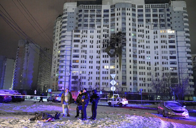 Police outside a building in Kyiv that was damaged in the overnight attack AP Photo/Efrem Lukatsky