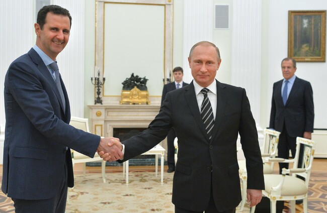 In this file photo taken on Tuesday, Oct. 20, 2015, Russian President Vladimir Putin, center, shakes hand with Syrian President Bashar Assad as Russian Foreign Minister Sergey Lavrov, right, looks on AP
